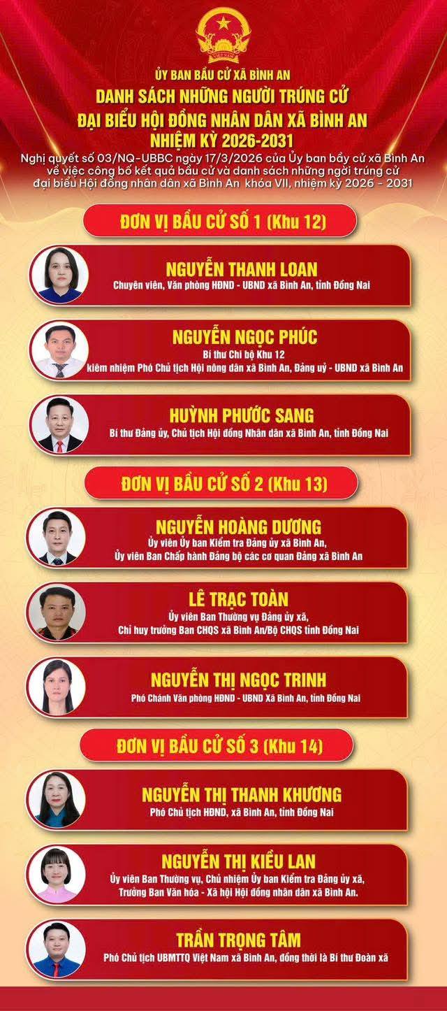 Ngày 17/03/2026 Ủy ban bầu cử xã Bình An ban hành Nghị quyết số 03/NQ-UBBC về việc công bố kết quả bầu cử và danh sách những người trúng cử đại biểu HĐND xã Bình An khóa VII, nhiệm kỳ 2026-2031