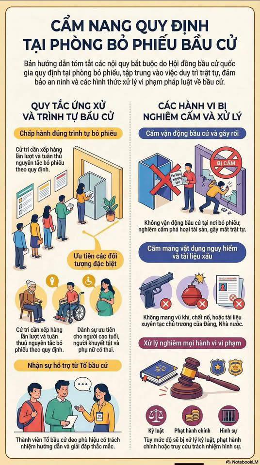 Đảm bảo trật tự: Cử tri cần xếp hàng theo đúng thứ tự, tuân thủ nghiêm túc sự hướng dẫn của các thành viên Tổ bầu cử (người có đeo phù hiệu trách nhiệm).